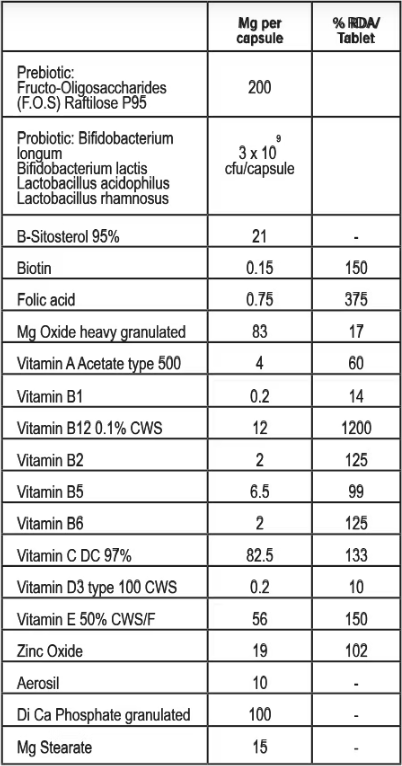 Ingredients: Probiotics, Prebiotics, Phytosterols and multivitamins.